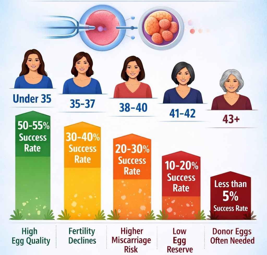 This detailed guide explains IVF success rates by age, egg quality, embryo development, miscarriage risk, live birth rates, and what options are available at different stages of life.